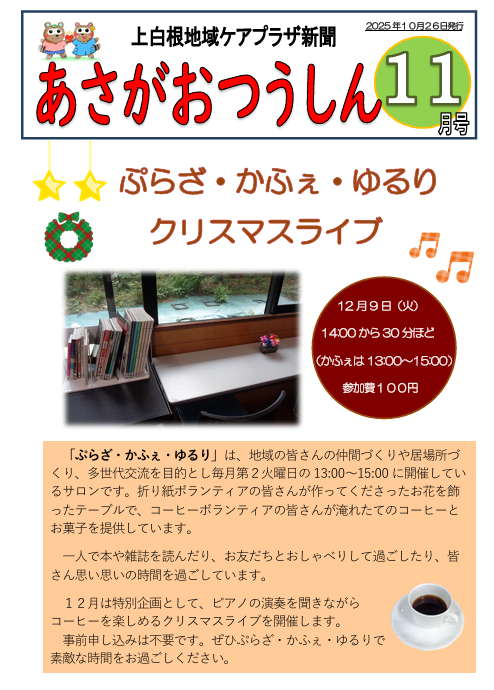 1面は、地域の皆さんの仲間づくりや居場所づくり、多世代交流を目的とした「ぷらざ・かふぇ・ゆるり」のクリスマスライブのご案内です。ピアノの演奏を聞きながら、ボランティアの皆さんがいれる、温かいコーヒーとお菓子を楽しみませんか。ぜひご参加ください。