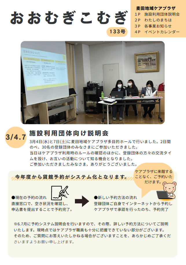 おおむぎこむぎ 133号 今回の内容は... 1P ・施設利用団体向け説明会の様子 ・貸館予約システムについて 2P ・わたしのまちはこんなまち☆サブコが聞いてみた ~上野町南部町内会編~ 3P ・地区社協だより ・各種事業紹介 4P ・イベントカレンダー(2.3月) 133号(2 MB)