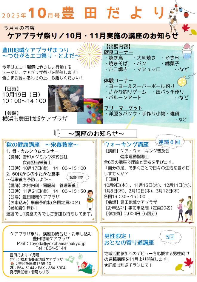 横浜市豊田地域ケアプラザ 〒244-0842 横浜市栄区飯島町1368-10 代表電話 045-864-5144 相談電話(福祉・保健に関する相談)045-864-5236 ファックス 045-864-5904 メール toyoda@yokohamashakyo.jp 【開館時間】 午前9時から午後9時(日曜・祝日等:午前9時から午後5時) 【休館日】 第2日曜日・年末年始(12月29日から1月3日) デイサービスは年末年始以外全日対応