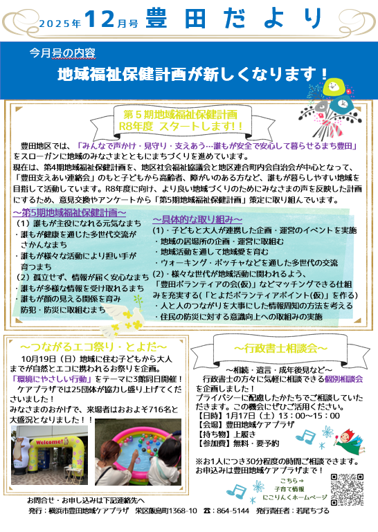 広報紙 豊田地域ケアプラザだより R7年度12月号 地域福祉保健計画が新しくなります! R7年度12月号(2 MB) 令和7年度 R7年度11月号 (2 MB) R7年度10月号 (2 MB) R7年度8月号 (1 MB) R7年度7月号 (1 MB) R7年度6月号 (1 MB) R7年度5月号 (1 MB) R7年度4月号 (3 MB) 令和6年度 R6年度3月号 (2 MB) R6年度2月号 (2 MB) R6年度12月号 (2 MB) R6年度11月号 (2 MB) R6年度10月号 (2 MB) R6年度8月号 (2 MB) R6年度7月号 (2 MB) R6年度6月号 (2 MB) R6年度5月号 (3 MB) R6年度4月号 (2 MB) 令和5年度 R5年度3月号 (2 MB) R5年度2月号 (2 MB) R5度12月号 (1 MB) R5年度11月号 (2 MB) R5年10月号 (2 MB) R5年度8月号 (2 MB) R5年7月号 (2 MB) R5年6月号 (1 MB) R5年5月号 (2 MB) R5年4月号 (1 MB) 令和4年度 R5年3月号 (2 MB) 2月号 (3 MB) 12月号 (3 MB) 11月号 (3 MB) 10月号 (3 MB) 8月号 (3 MB) 7月号 (2 MB) 6月号 (2 MB) 5月号 (2 MB) 4月号 (3 MB) 令和3年度 3月号 (3 MB) 2月号 (3 MB) 12月号 (4 MB) 11月号 (3 MB) 10月号 (2 MB) 8月号 (2 MB) 7月号 (4 MB) 6月号 (2 MB) 5月号 (3 MB) 4月号 (2 MB) 令和2年度 3月号 (2 MB) 2月号 (3 MB) 12月号 (3 MB) 11月号 (2 MB) 10月号 (2 MB) 9月号 (3 MB) 8月号 (2 MB) 7月号 (3 MB) 6月号 (1 MB) 5月号 (2 MB) 4月号 (2 MB)