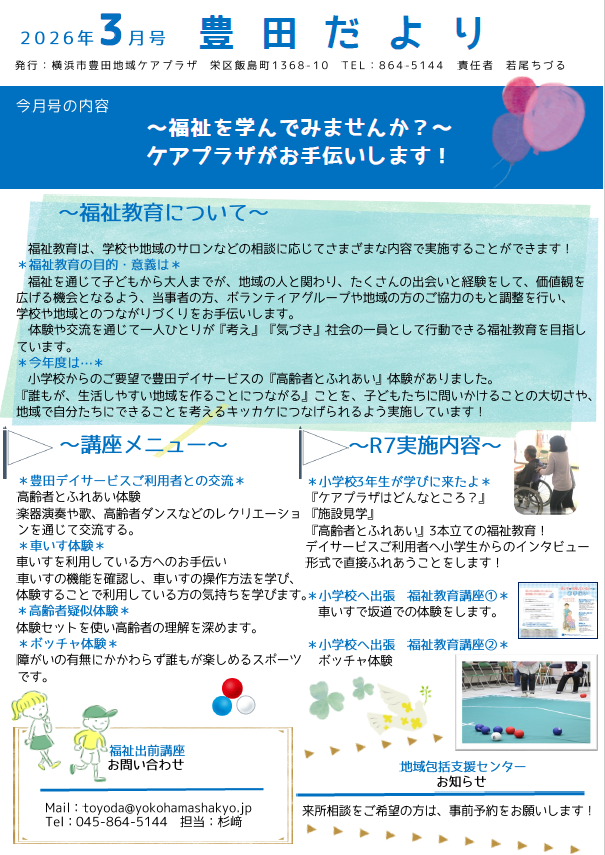 広報紙 豊田地域ケアプラザだより R7年度3月号 ~福祉を学んでみませんか?~ ケアプラザがお手伝いします! R7年度3月号(3 MB) 令和7年度 豊田地域ケアプラザだよりR7年度2月号 (2 MB) R7年度12月号 (2 MB) R7年度11月号 (2 MB) R7年度10月号 (2 MB) R7年度8月号 (1 MB) R7年度7月号 (1 MB) R7年度6月号 (1 MB) R7年度5月号 (1 MB) R7年度4月号 (3 MB) 令和6年度 R6年度3月号 (2 MB) R6年度2月号 (2 MB) R6年度12月号 (2 MB) R6年度11月号 (2 MB) R6年度10月号 (2 MB) R6年度8月号 (2 MB) R6年度7月号 (2 MB) R6年度6月号 (2 MB) R6年度5月号 (3 MB) R6年度4月号 (2 MB) 令和5年度 R5年度3月号 (2 MB) R5年度2月号 (2 MB) R5度12月号 (1 MB) R5年度11月号 (2 MB) R5年10月号 (2 MB) R5年度8月号 (2 MB) R5年7月号 (2 MB) R5年6月号 (1 MB) R5年5月号 (2 MB) R5年4月号 (1 MB) 令和4年度 R5年3月号 (2 MB) 2月号 (3 MB) 12月号 (3 MB) 11月号 (3 MB) 10月号 (3 MB) 8月号 (3 MB) 7月号 (2 MB) 6月号 (2 MB) 5月号 (2 MB) 4月号 (3 MB) 令和3年度 3月号 (3 MB) 2月号 (3 MB) 12月号 (4 MB) 11月号 (3 MB) 10月号 (2 MB) 8月号 (2 MB) 7月号 (4 MB) 6月号 (2 MB) 5月号 (3 MB) 4月号 (2 MB) 令和2年度 3月号 (2 MB) 2月号 (3 MB) 12月号 (3 MB) 11月号 (2 MB) 10月号 (2 MB) 9月号 (3 MB) 8月号 (2 MB) 7月号 (3 MB) 6月号 (1 MB) 5月号 (2 MB) 4月号 (2 MB)